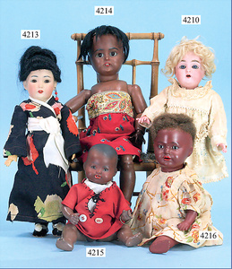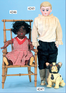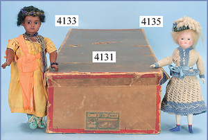 K & R 101, farbige Charakterpuppe, Biskuitkurbelkopf, braune gemalte Augen, geschl. Mund, dunkel gefärbter Körper, Kopfrand minim. beim Brennen aufgeplatzt, davon kein Riss ausgehend, alte Kleidung, selten