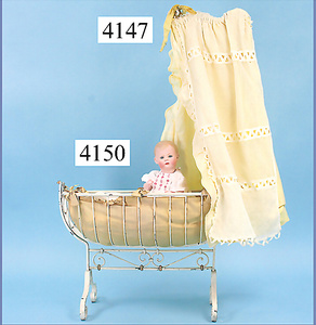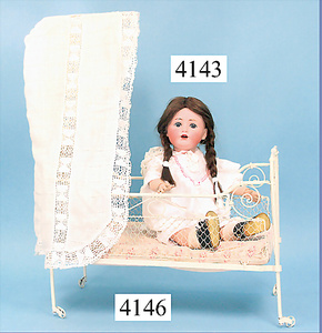 Puppenbett, wohl GOTTSCHALK, 36 cm, Holz lackiert, mit Bettzeug u. Himmel, schöne Gr.