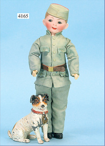KÄTHE KRUSE Puppe Nr. I, 3 Hinterkopfnähte, Stoffkopf, breite Hüfte, separat abgenähter Daumen, ca. 2mm Farbabplatzer unter der Nase seitlich, Körper altersbedingt an kl. Stellen etwas verschmutzt, sonst sehr schöner Orig.-Zust., alte Kleidung, dazu altes Holzgewehr u. Säbel, priv. Dachbodenfund