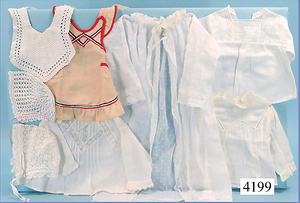 DORA PETZOLD Künstlerpuppe, 20er Jahre, modellierter Kompositionskopf, blaue gemalte Augen, geschl. Mund, Stoffkörper, Orig.-Kleidung mit Unterwäsche, gemarkt DORA PETZOLD Registered Trade Mark Doll Germany, Nase restauriert, sonst gut