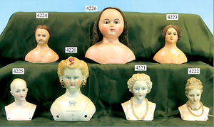 Papiermaché-Brustblattkopf-Puppe, 74 cm, stark ausmodellierte Haare, mit angedeutetem Haarband, gemalte Augen, geschl. Mund, Kopf teilw, farblich überarbeitet, Stoffkörper, Porzellanunterarme, alte Kleidung, alte Schuhe