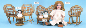 Puppen-Sitzgruppe, filigranes Korbgeflecht, 2 Sessel, Bank, 24 cm, Tisch, Schaukelstuhl, für 30 - 35 cm Puppen, kl. Fehlstellen, sonst gut
