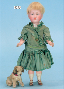 SIMON & HALBIG 1339, Biskuitporzellan-Charakterpuppe, Kindergesicht, gemarkt S & H L. L. & S., für Louis Lindner & Söhne, nachträglich fest eingesetzte blaue Glasaugen, off. Mund, oben Zähne, durchst. Ohren, Masse-Brustblatt, diese Variante ist uns unbekannt, Körper farblich überarbeite, alte Kleidung, alte Perücke, 52 cm