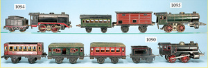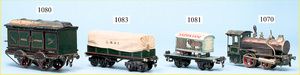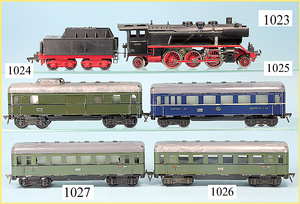MÄRKLIN, Spur 0, Konv. Bestehend aus 880 Schlepptenderlok B, grün/schwarz, mit Tender, Uhrwerk intakt, guter Zust., dazu off. Güterwagen, 1761, automatische Kupplung, 1 Achse fehlt, Nr. 3 1772, Rungen mit Bremserhaus, 1 Postwagen 1728, automatische Kupplung, 1 Achse fehlt,