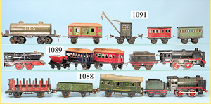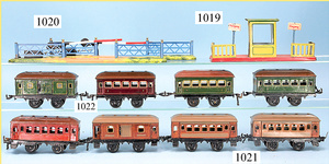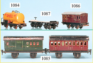 Konv. Meist BING, Spur 0, 5 Teile, Güter -und Personenwagen, darunter 4-achsiger Tankwagen, 1025, Blech lithogr., 1 Kranwagen, 1 Gepäckwagen, 2 kl. Personenwagen, bespielt, gut