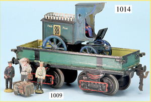 MÄRKLIN, Uralt, Militärtransportwagen 1818, Spur 1, mit Feldpostkutsche beladen, Unterwagen mit abklappbaren Bordwänden u. Balkendrehgestellen, alte Hakenkupplung, Länge 21 cm, Feldpostwagen in blauer Handlackierung, mit hinterer Tür, Kutschbock mit Fahrerfigur, schwere Eisenräder, Deichsel fehlt, Länge 12 cm, sehr selten u. eine große Rarität