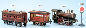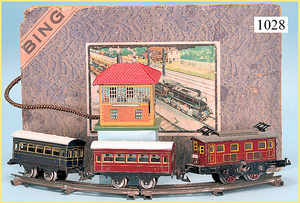 BING, Zugpackung, Spur 0, elektr. Ausführung, E-Lok B, Blech lithogr., 1 beleuchtete Stirnlampe, 2 Personenwagen, Gleismaterial, Stellwerkhäuschen, Transformator, Orig.-Kart. Verschlissen