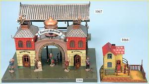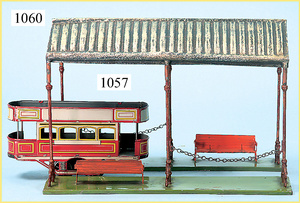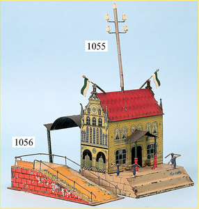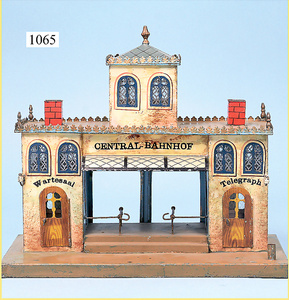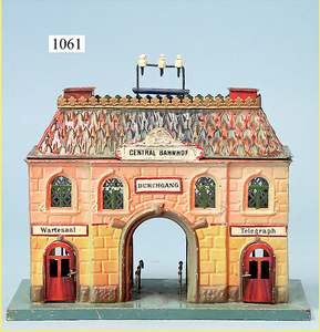 CARETTE, Bahnhof mit Durchfahrtshalle, Blech lithogr., 18 x 38 cm, 2 x Fahnen, 1 x Telegraphenmast, Säulen vom Dach lose, gemarkt am Dachsockel 1898, leichte altersbedingte Lackabplatzer, sonst guter Zust.