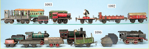 Spur 0, Schlepptenderlok B, wohl Distler, dazu 3 einfache Personenwagen, 2-achsig, bespielt, 1 Achse fehlt, 1 geschl. Güterwagen, Dach fehlt, ein paar Fragmente, einfache Kipplore, 1 Schlepptenderlok, nicht kompl.