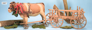 STEIFF, Kuh, ca. 1910, 53 cm, mit Knopf, Schuhknopfaugen, Lederhörner, auf schweren Guss-Speichenrädern, mit Zaumzeug, stark abgeliebt, Zugstimme defekt, Stoff an ein paar Stellen etwas aufgerieben, mit Holzleiterwagen aus der Zeit, schöne Deko