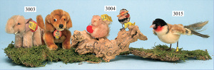 STEIFF, Wollminiatur, Eichhörnchen, mit Knopf u. Fahne, Nr. auf Fahne 4505, 1 Wollminiatur Spatz mit Zweig, mit Knopf u. Fahne, Nr. auf Fahne 6504.5
