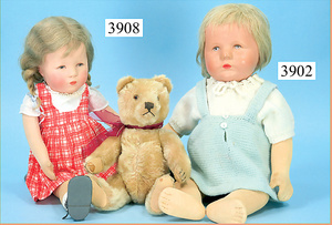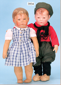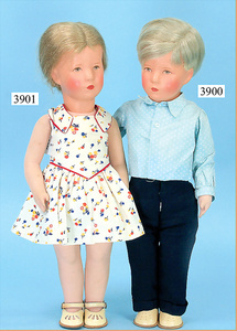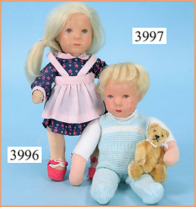 KÄTHE KRUSE, Puppenpaar, dt. Kind, 36 cm, 60er Jahre, Kunststoffkopf, Trikotkörper, Orig.-Kleidung, Schuhe u. Strümpfe, unbespielt