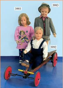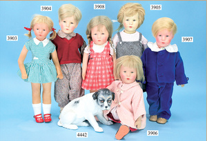 KÄTHE KRUSE, Schaufensterpuppe, Junge, 76 cm, Magnesitkopf, gemalte Augen, aufgesetzte Wimpern, Orig.-Perücke mit Druckknöpfen, Sitzkörper, mit lose angenähten Armen u. Beinen, Trikot an der Hand etwas verschlissen, schöne Bemalung, schöner Orig.-Zust., ausdrucksstark