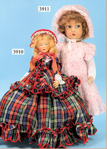 Puppe, Massekopf, braune gemalte Augen, Stoffkörper, breite Hüfte, separat angenähter Daumen, alte Kleidung, Lackabplatzer an den Ohren, sonst gut