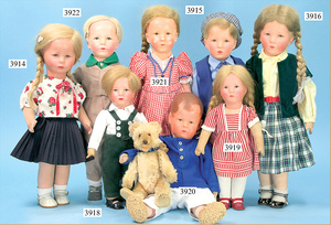 Käthe Kruse, schlankes Enkelkind, Nachkrieg, 45 cm hoch, Kunststoffkopf, Trikotkörper m. extrem langen Beinen, Körper ein wenig verschmutzt, sonst guter Zustand, alte Kleidung, selten