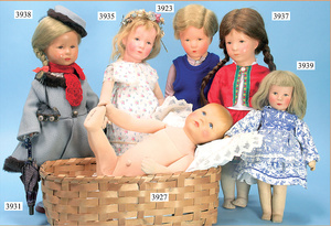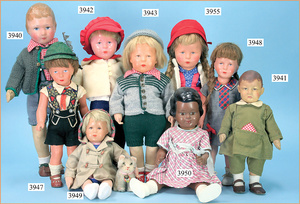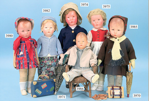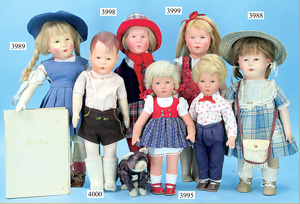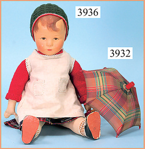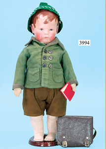 KÄTHE KRUSE, Schielböckchen, 1930, Puppe Nr. XI, 50 cm, Stoffkopf, deutlich sichtbare Hinterkopfnaht, Herzmund Bemalung, dünnes Mohair, seitl. blickende gemalte Augen, Trikotkörper, leichte Farbabweichung am Stoff des Halses, Trikotkörper, leicht eingeknickte Beine, in den Kniekehlen abgenäht, an der Naht eingerissen, 1 Seite mit Heftpflaster beklebt, absolut selten, Bericht über diese Puppe Puppenmagazin 2002, Nr. 2, Seite 12, Schielböckchen wurden für den Export ein halbes Jahr produziert, nur wenige Stücke fest in Sammlerhand, im Bericht des Spielzeugmagazins, vom Schielböckchen und der schönen Dorothee ist eine Postkarte eines Käthe Kruse Jungen mit seitl. Blickenden Augen abgebildet, alte Kleidung, alte Schuhe, Bemalung in sehr gutem Zust.