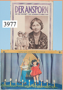 KÄTHE KRUSE, Konv. 2 Teile Puppenbücher, Nr. 1 Der Ansporn, Die Zeitschrift für Vorwärtstreibende, mit gr. Bericht über das Unternehmen Käthe Kruse, 20. November 1930, Heft 22, Nr. 2 KÄTHE KRUSE Kalender, Leipziger Adventskalender, 50er Jahre, Zust. 2 - 3