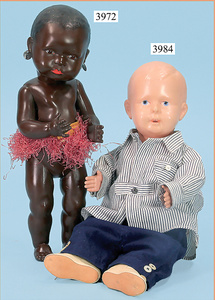 SCHILDKRÖT, Modepuppe, Celluloid, 20er Jahre, 38,5 cm, fester Kopf, braune fest eingesetzte Glasaugen, bewegl. Arme und Beine, auflackierte Strümpfe mit Orig.-Sockel, absolut selten, unbespielter Orig.-Zust.