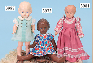 STORCH, Mädchen, schwarz, 42 cm, Tortulon, braune fest eingesetzte Glasaugen, stark ausmodellierte Haare, Stehkörper, sehr guter Zust.