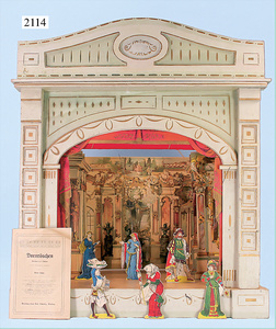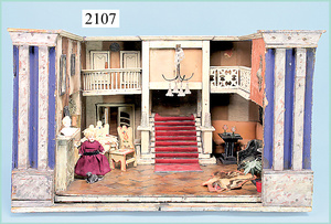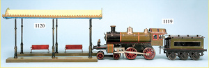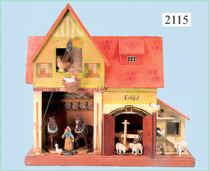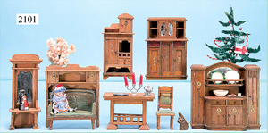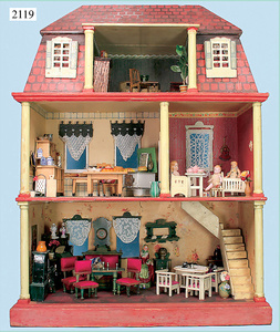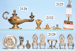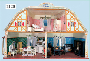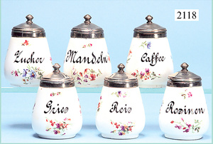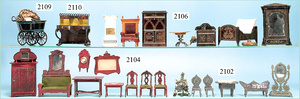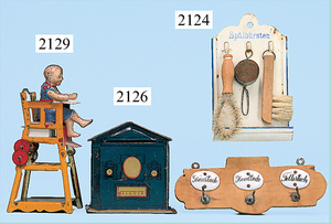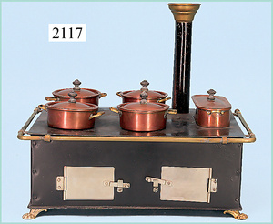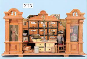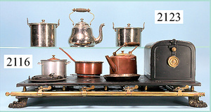 Rauchfangküche, ca. 1850, 76 cm, breit, 45 cm hoch, 43,5 cm tief, fest eingebaute Regale, eingebauter Schrank, Feuerstelle, mit Eckrauchfang, alte Bemalung, Handbemalung, innen und außen später, reichhaltig Zubehör, 15 Teile Kupfer gehämmert, Töpfe, Pfannen, Sieb, Backform, 12 Backformen, darunter Fischform, Hummerform, 16 Zinnkrügen, Zinn-Essensträger, 2-lagig, 15 gedrehte Zinnteller, aufwendig gearbeiteter Weißblech-Leuchter, dazu Messing-, Holz- u. Weißblechteile, museal