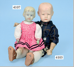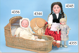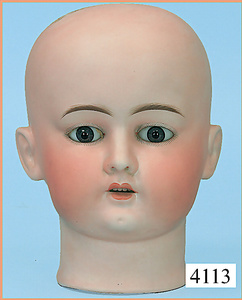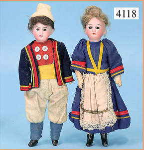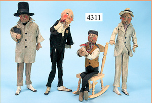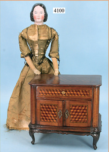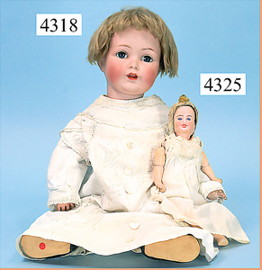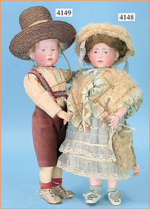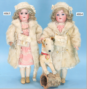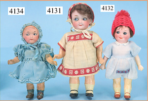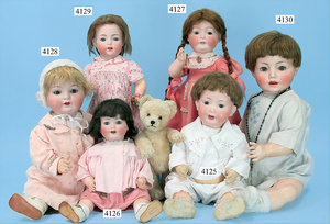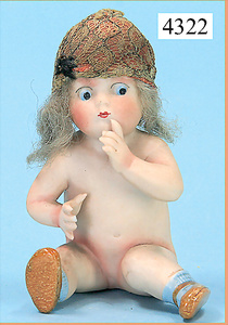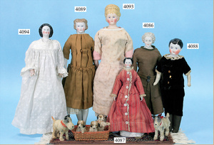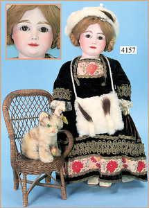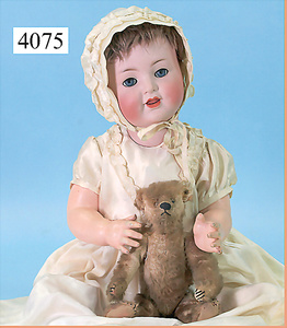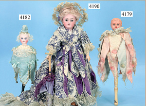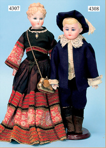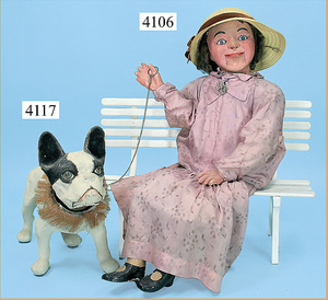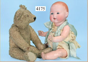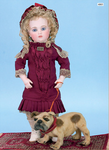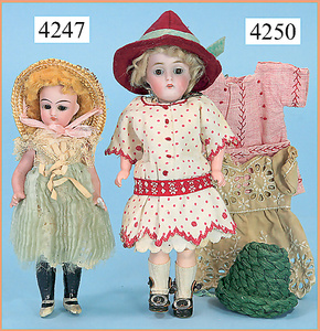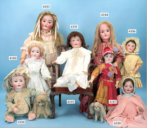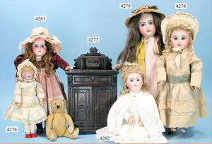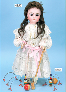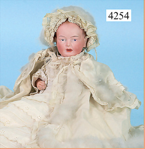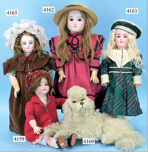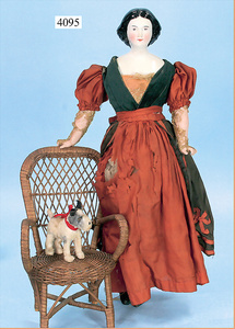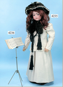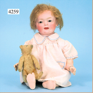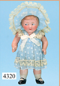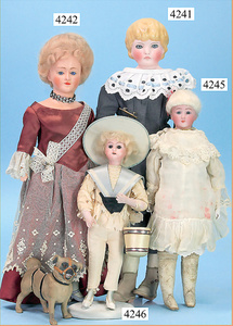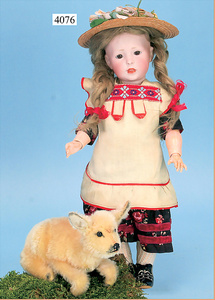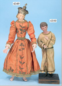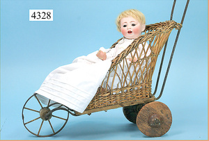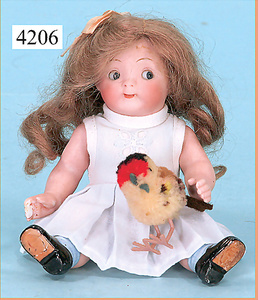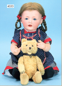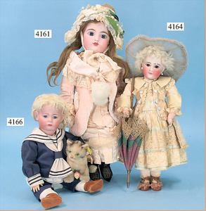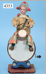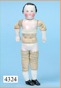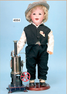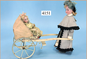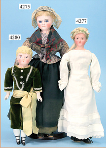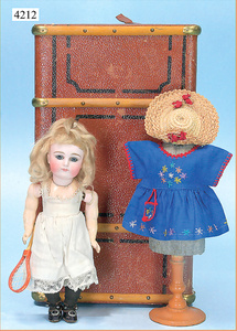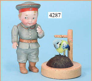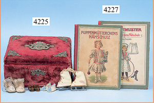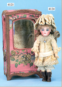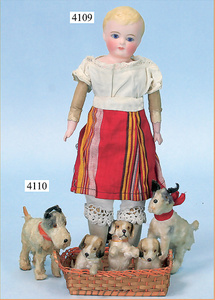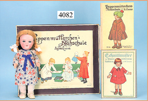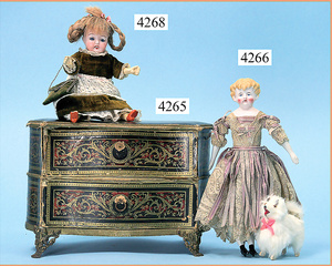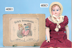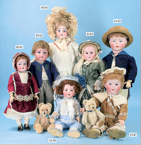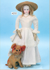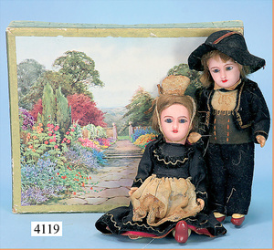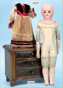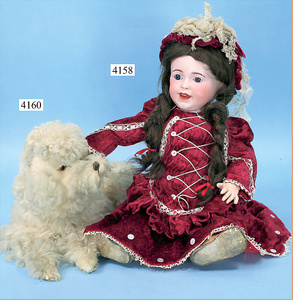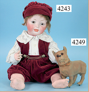 STEINER, Biskuitporzellankopf-Puppe, Figure 9, Paris, 42 cm, gepresster Biskuitkurbelkopf, um 1885/90, blaue fest eingesetzte Glasaugen, geschl. Mund, durchst. Ohren, Orig.-Spiralfederaufzug, franz. Gliederkörper, Körper mit Zugstimme, feste Handgelenke, Papiermaché-Kopfdeckel, Echthaarperücke, alte Kleidung, Hut aus alten Stoffen genäht, Sohle an 1 Schuh fehlt