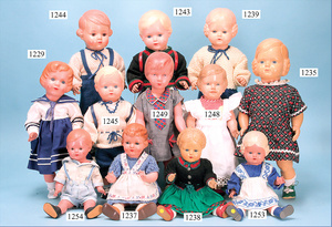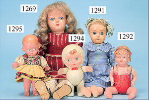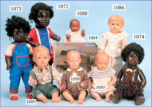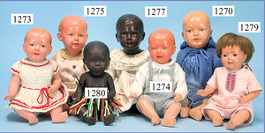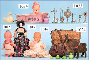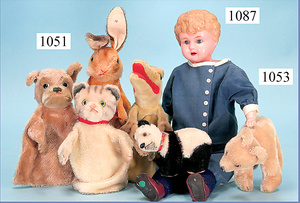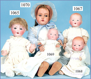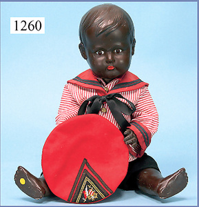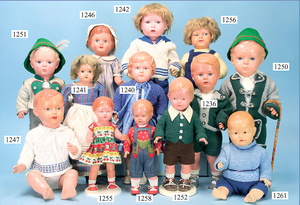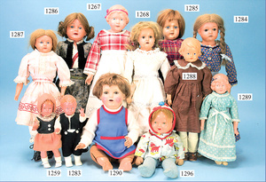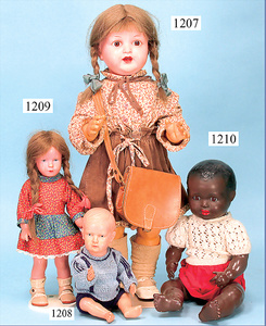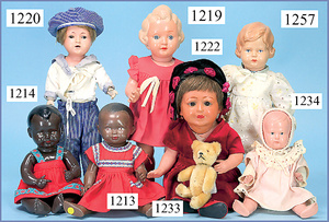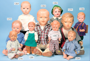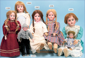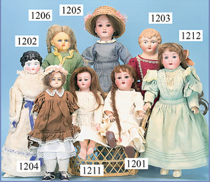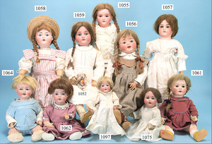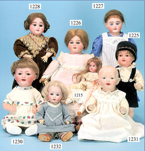A.M. Porzellan-Burstblattkopf-Puppe, gemarkt 370 9 DEP, braune Schlafaugen, off. Mund, Zähne, ein Zahn weggebrochen, Echthaarperücke fest aufgeklebt, bitte Transportrisiko der Augen beachten, auf Lederkörper, Porzellan-Unterarme, re. Arm überstrichen, ein Finger weggebrochen, 76 cm, alte Kleidung