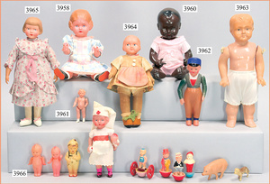 3 parts celluloid roly-poly figures, with 1 roly-poly figure with wheels, 2 celluloid animals, celluloid pig/dog, 2 Kewpie celluloid Japan, 1 celluloid doll Japan midwife with child and bottle, and 1 celluloid child with appropiated clothes and whistle,