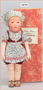 KÄTHE KRUSE, No. 1H, 42 cm, fabric head, 3 seams at the back of the head, slim hip, glued on original wig, without damage original condition, original clothes, in original box, label model 1, original KÄTHE KRUSE, signed on the hand, and on the box Bärbelchen Fine 1, absolutely rare in this condition