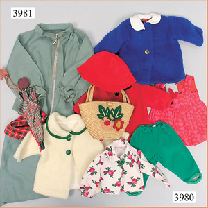 6 parts, clothes going with KÄTHE KRUSE dolls, '30s, 1 doll basket, with 1 Käthe Kruse umbrella