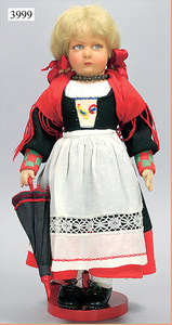 LENCI, doll with traditional costume, c. 1931, 48 cm, to the side looking painted eyes, closed mouth, mohair wig, original felt body, original felt clothes, with umbrella, (doll with the same clothes is pictured in: Sabine Reinelt: "Lenci Zauberwelt der Lenci-Puppen", page 52), with wooden stand, very good condition