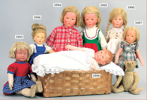 SCHILDKRÖT, SiR, rare head with flange neck, Kewpie, 21.5 cm, with painted eyes that are looking to the side, closed mouth, fabric body, original clothes and shoes