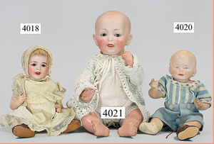 JDK, bisque character baby, 34 cm, full head, brown sleepy eyes, opened/closed mouth, with appropiated tongue, (please note that it is risky to transport the eye mechanism), baby with sitting body with different postures of hands and slightly stick out toes, old clothes