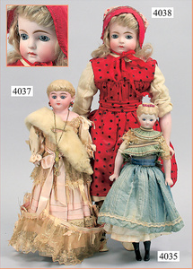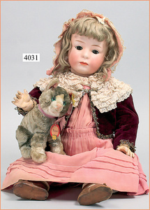 PARIAN, unusual bisque shoulder headed doll, marked Germany 31 B 3, 34 cm, fix inset blue glass eyes, closed mouth, pierced ears, fine modelled hair (in the back it reaches down to the neck), uncovered ears, leather body, bisque forearms, silk dress is strongly worn