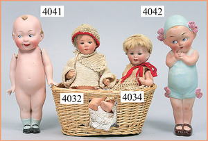 HEUBACH, 399, coloerd socket head doll that is made of squirted porcelain, 17 cm, full head, fix inset brown glass eyes, formed baby with sitting body, flaked off paint part at the back of the head, and at the left ear too