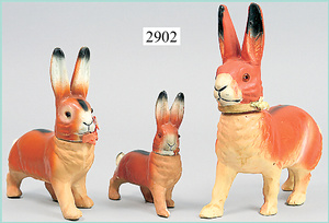 3 papier mâché hares, with removable head, 14 cm - 22 cm, the cracks at the feet are caused of old age, small repaired places