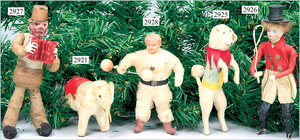 female animal trainer with whip, cotton wool, head ismade of bisque, dress is made of crepe and paper, 13.5 cm, nice condition
