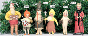 dwarf with pickaxe, cotton wool, face ismade of mass, pinafore is made of paper, pick is made of paper and wood, 9.5 cm, very good condition