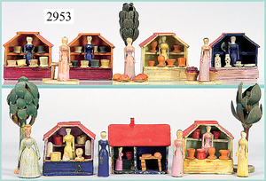 ERZGEBIRGE, weekly market scene, figures, stalls, 1 building, 2 Lufa trees, height of figure 4 cm