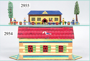 ERZGEBIRGE, Biedermeier weekly market, 10 stalls with figures and accessories and chip trees in chipboard boxes, around 1860