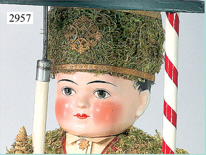 ERZGEBIRGE, Christmas pyramid, Moosmann with porcelain head, holding the pyramide, equiped with Seifern wood and bread dough figures, ( Samt. Hasustein ), 1890, very decorative