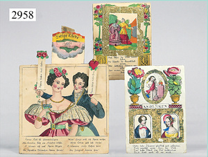 3 parts congratulatory pictures, Biedermeier, print was colored by hand, with aphorisms, 2 cm by 8.5 cm, a picture 12 cm by 12 cm, with pull mechanism