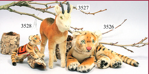 STEIFF, tiger, mascot of the Princton University, mohair yellow/brown, black striped, sitting, svivel head, opened mouth, teeth, green/black squinting, press voice is faulty, seat height 25 cm, produced in 1952, good condition