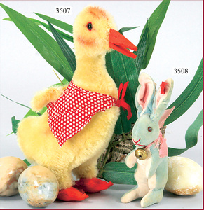 STEIFF, duck, mohair plush, yellow, standing, with jacket, without wheels, broad soft felt feet, 23 cm standing height, produced c. between 1928 and 1932, with button and red cloth tag label, number on cloth tag label 1323,6 very good condition