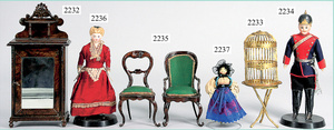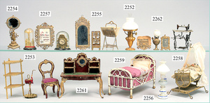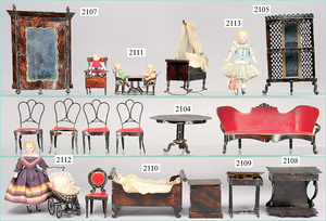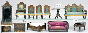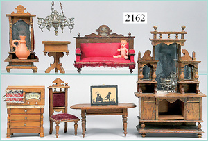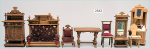 Wilhelmine era, parts from a furniture program, sofa 20 cm wide, cupboard 23 cm tall, 2 mirrors, 2 chairs, armchair, table, 1 washstand with tiltable mirror, small articles are missing, not all parts are going well together