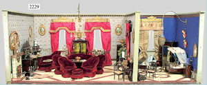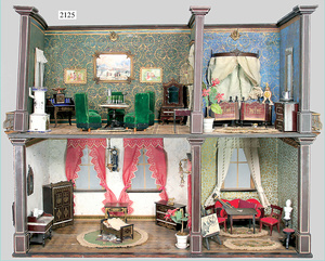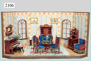 dollhouse, 73 cm wide, 38.5 cm tall, 42 cm deep, in the back 2 windows, furnished, piano, cupboard, height 24 cm, art nouveau decor, accessories, tin, glass parts, porcelain parts, 2 picture frames, gilded brass/tin, wallpapers were supplement with old wallpapers, nice form