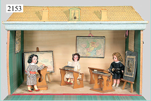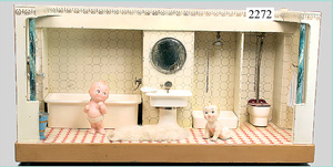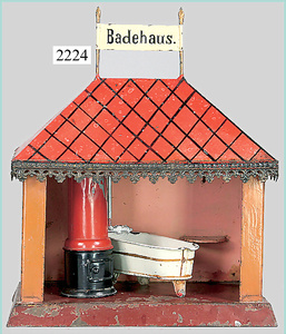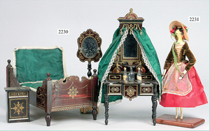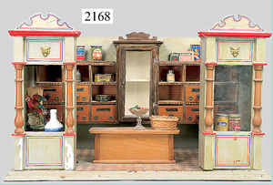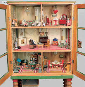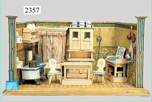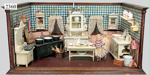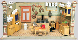 dollhouse kitchen, c. 1895, width: 87 cm, height 45 cm, depth 39 cm, original painting, inside and outside, original wallpaper at wall and bottom, front borders with richly ornaments, 1 windows, tin furnitures by the company Bing, unusual early tin stove with lithographied tiles, high-quality accessories, meal carrier, plate holder, egg box, bread slicer, porcelain parts