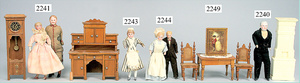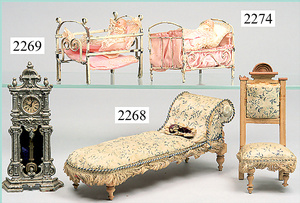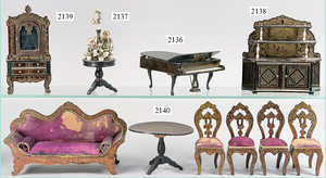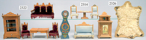 dollhouse furniture program, oak, around 1900, surrounded sofa, 23 cm wide, 19 cm tall, 6-chairs with armrest, flower column, pull-out table, grandfather clock, cupboard, sideboard, style Paul Leonhardt, around 1900