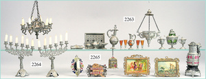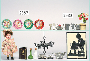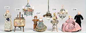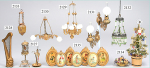 mixed lot of dollhouse decoration parts, ceiling lamp, tin, 6-armed, 9.5 cm, tin parts, glass parts, pictures, small album, 1 dollhouse doll, 12.5 cm, knocked foot, not all items were photographed