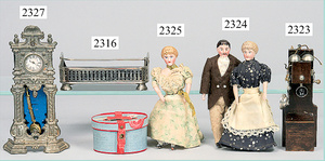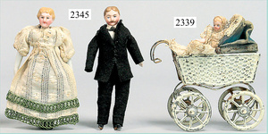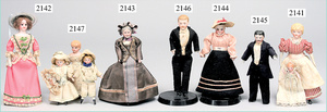 2 pieces dollhouse dolls, housekeeper, 12 cm, bisque head, arms and legs, fabric body, nice modelled hairstyle, original clothes, with suitable man, 13 cm, bisqueshoulder headed doll, arms and legs, fabric body, slightly appropiated moustache, original clothes