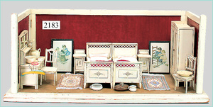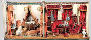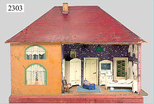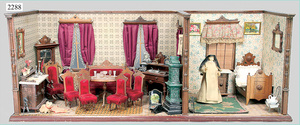 2-part dollhouse, living-room and bedroom, c. 1920, old wallpaper at wall and floor, nice furniture programs from this period, with passage door, 2 windows, 88 cm